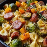 Combine Everything: Add the cooked pasta to the skillet and toss it to coat with the butter and garlic. Season with salt, pepper, and smoked paprika. Then, add the roasted butternut squash, roasted Brussels sprouts, cooked sausage, and fresh thyme. Gently mix everything together, adding a bit of reserved pasta water if needed to loosen the dish.