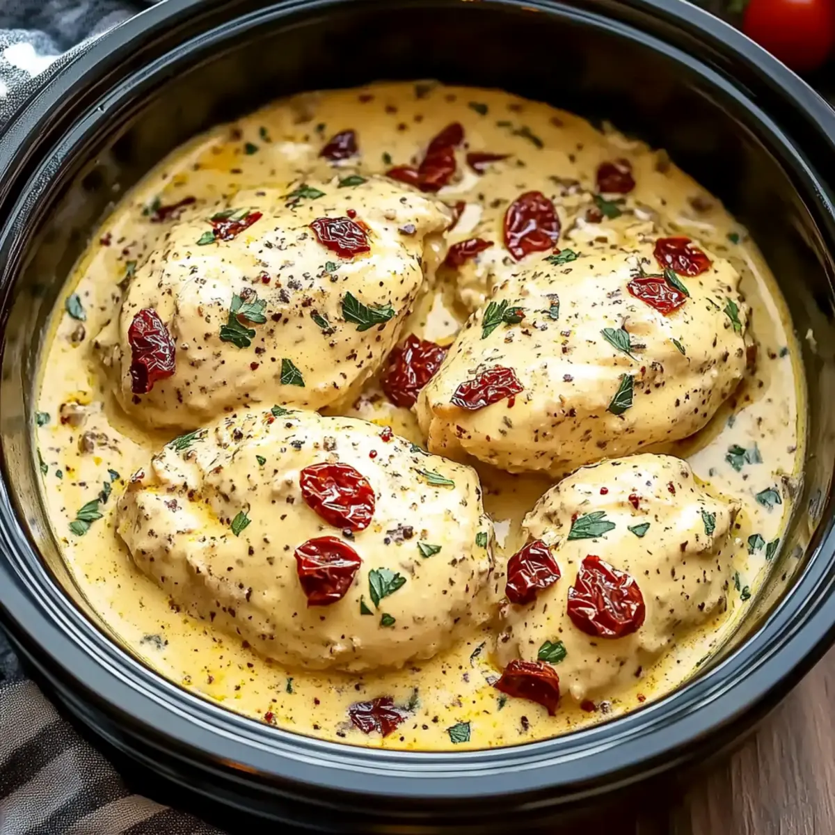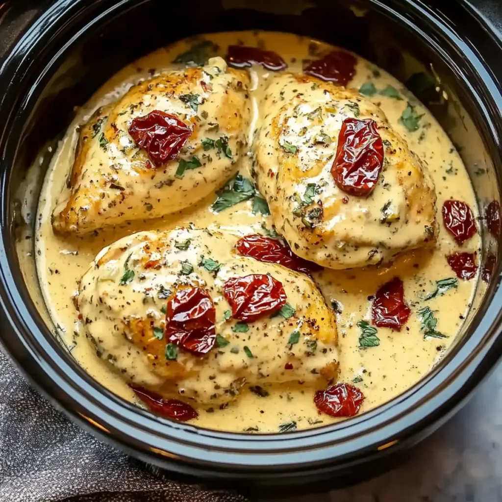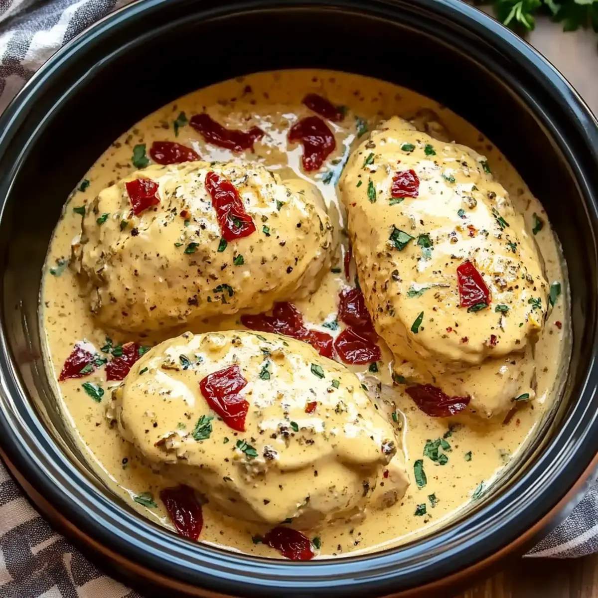 Top the chicken with chopped sun-dried tomatoes for an added burst of flavor and a touch of sweetness. The tomatoes will infuse a lovely tanginess into the dish as it simmers.