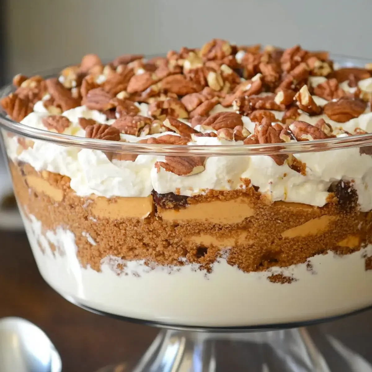 Layer the trifle: Cut the cooled cake into 1-inch cubes. In a large trifle dish, start layering: place ⅓ of the cake cubes on the bottom, followed by ⅓ of the pudding mixture, and then sprinkle ⅓ of the chopped pecans and toffee bits. Repeat this layering process until all ingredients are used up.