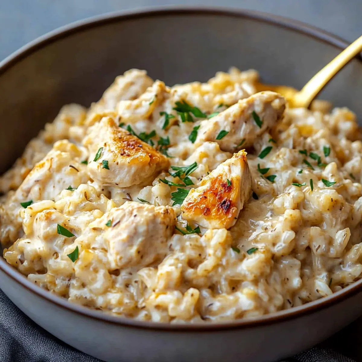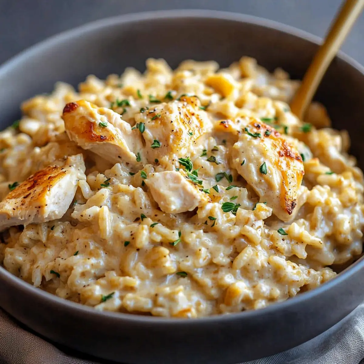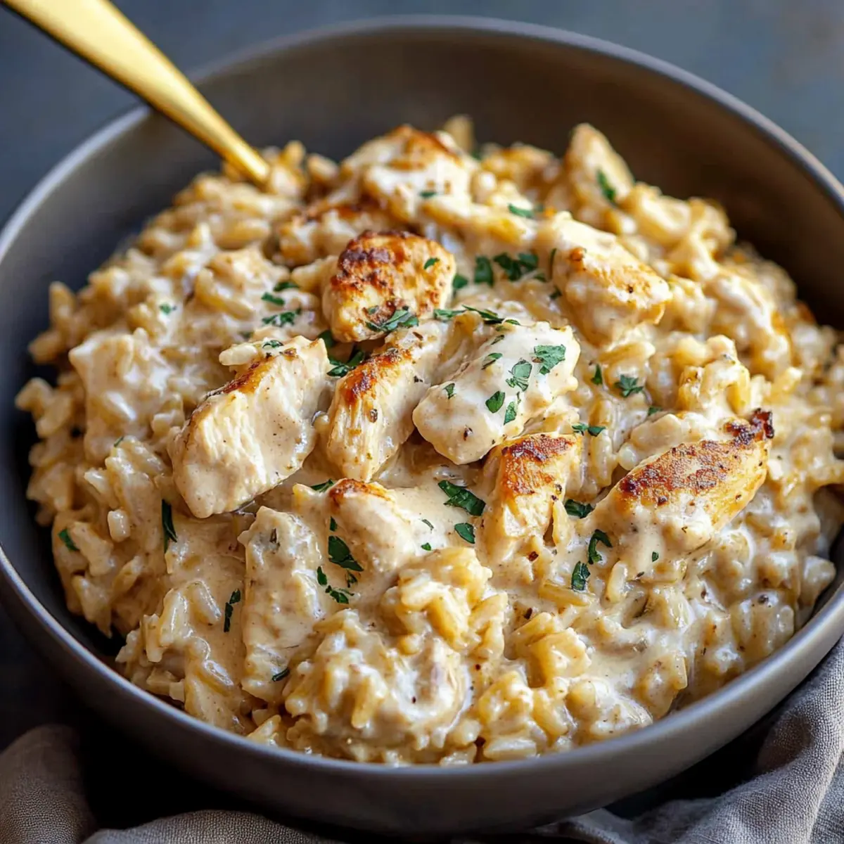 - Spoon the creamy chicken and rice into bowls, garnishing with fresh herbs if desired, and serve hot.