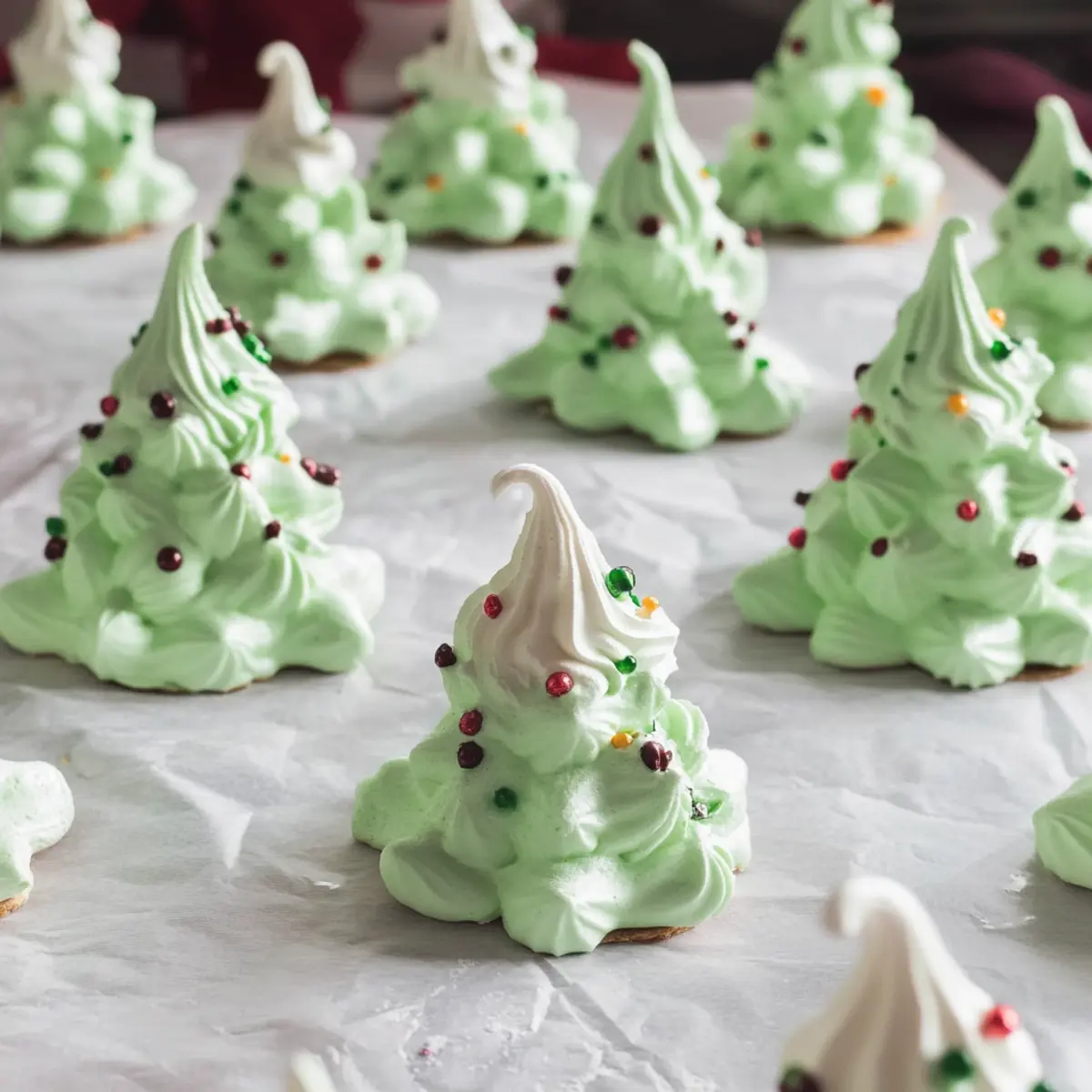 The holidays beckon for treats that spark joy and delight; pair these meringue Christmas trees with some complementary favorites!